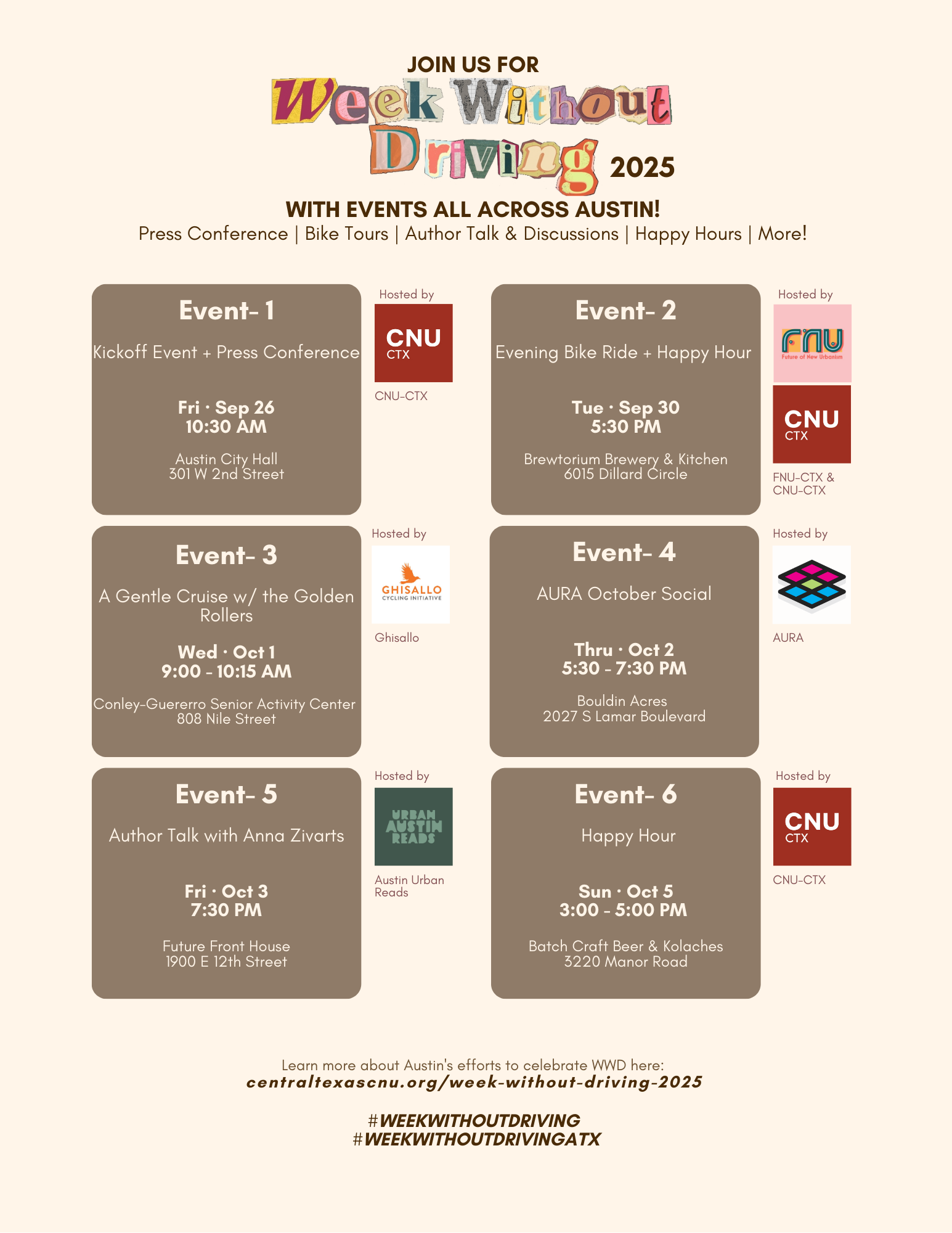 CNU-CTX is proud to host Week Without Driving 2025 in Austin alongside a coalition of partners including Transit Forward, Movability, Rethink 35, Ghisallo Cycling Initiative, AIA Austin, Perkins&Will, Reconnect Austin, Future of New Urbanism, CapMetro, AURA, SafeStreets Austin, The Pedestrian Advisory Council, Redline Parkway Initiative, Urban Austin Reads, ADAPT of Texas, Code Studio, Black + Motal Architecture, ULI Austin, Get There ATX, McCann Adams Studio, Austin Outside, and Active Towns.
